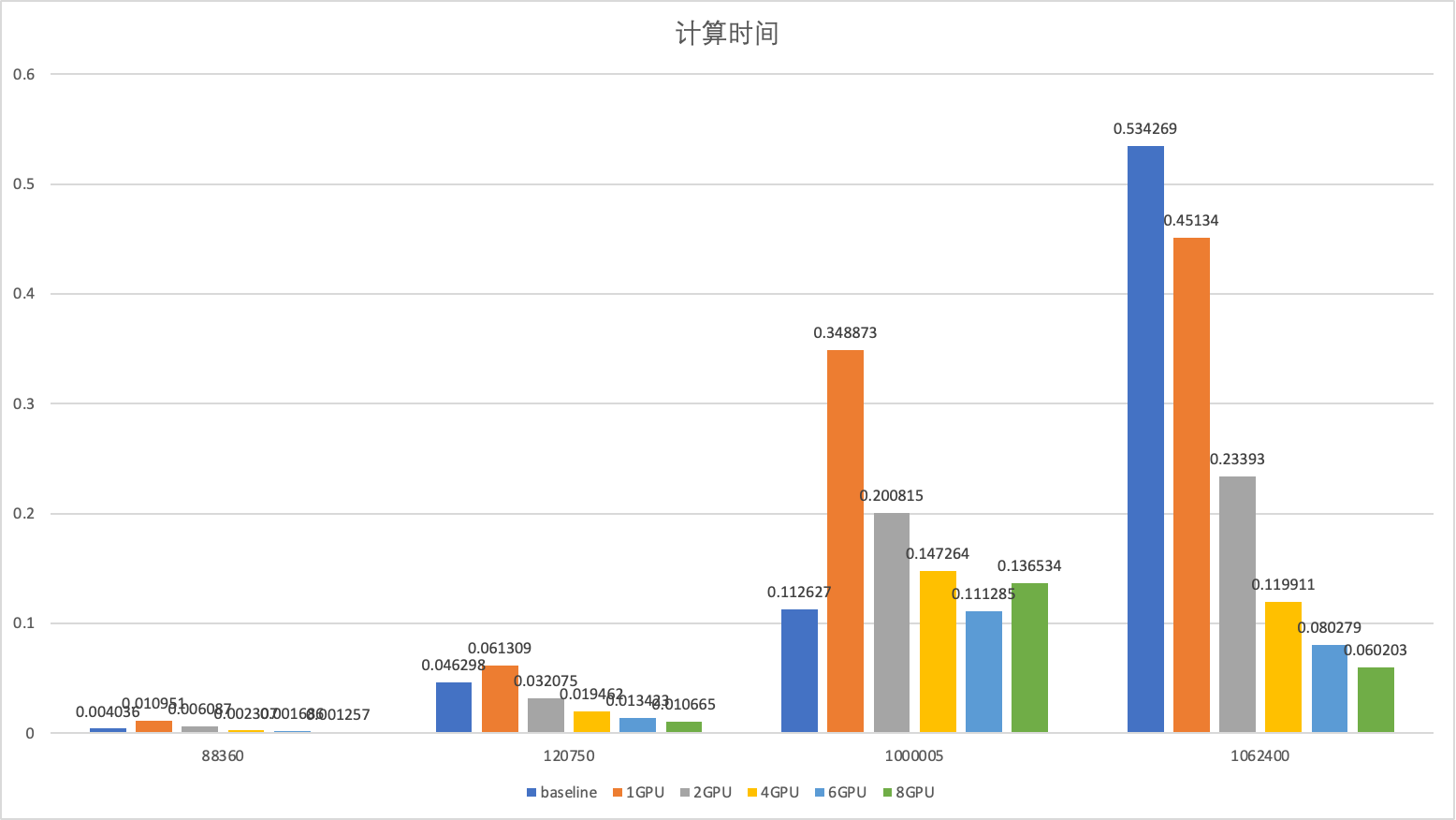 通过观察倍数曲线可以发现随着GPU数量的提升,系统性能的提升倍数在不断收敛,证明除了并行部分,串形部分的性能逐渐成为系统的性能瓶颈。